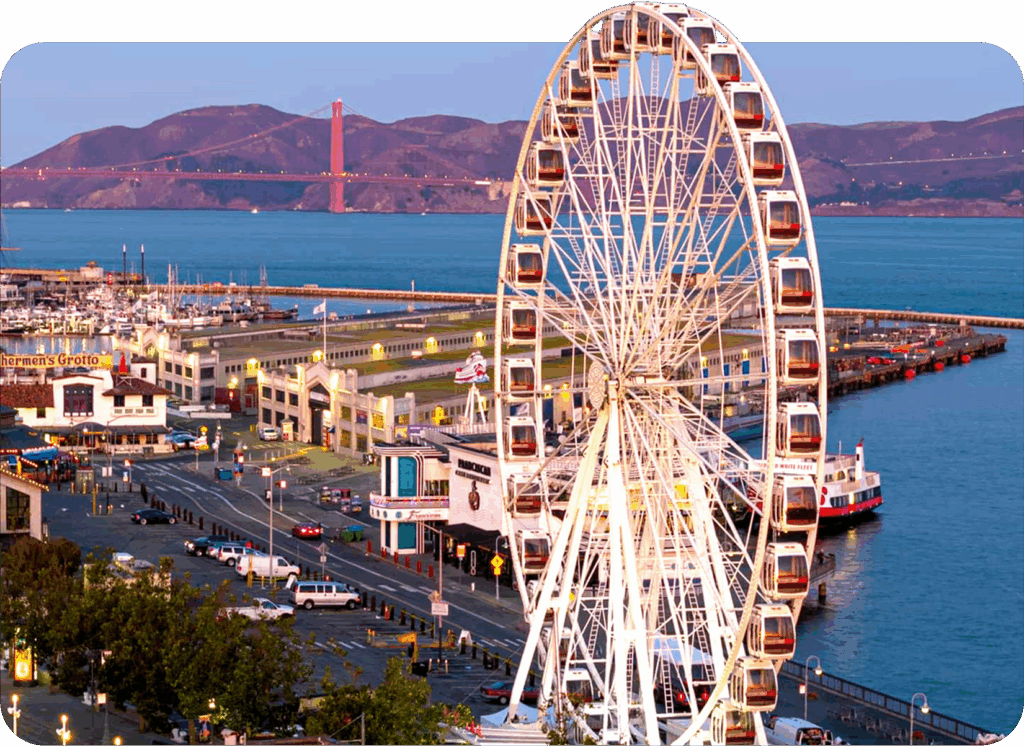 Located along the waterfront at Fisherman’s Wharf, the SkyStar Wheel takes you 150 feet above the Bay in fully enclosed, climate-controlled gondolas. It’s the best way to cap off your Pier 39 adventure with panoramic views of the skyline, Alcatraz, and the Golden Gate Bridge.